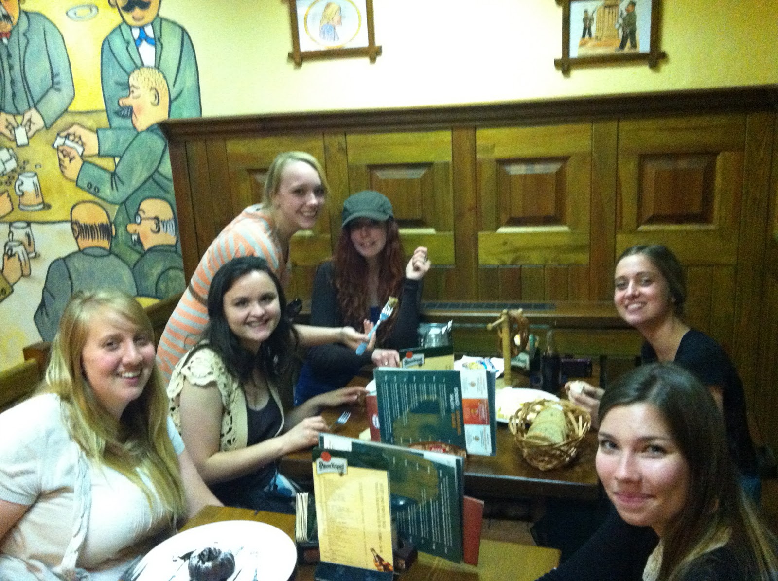 Today was a very relaxed day in Prague. I slept in a little and then we had a long Historic Clothing class. After that we went in to the city/old town and kind of just walked around and went to a fun market. We went and got some authentic Czech food, which was incredibly delicious until I tasted the nastiest thing I have ever tasted. We got a cheese platter and I was eating a little cube of one of the cheeses, it smelt so so bad, but I thought I should probably just taste it because maybe it was good and it was part of the experience. Well it literally tasted how I would imagine poo tasting. A missionary told me tonight that that type of cheese is made under raw meat. UM YUCK! Anyways, then we went to Family Home Evening at the church. We had some yummy Russian food and "American Cupcakes" which was all delicious. We were in fabulous company. Prague is such a melting pot. I don't think Jake was too happy to see us again haha. He is so focused. I don't think he liked us calling him Jake, so I started calling him Elder Osterloh. He didn't talk to me and Mel for a bit after we got there and after a while he came and sat by us and said "sorry I haven't talked to you guys, I'm just trying to focus." How cute is that? Him and his companion took a cupcake to someone outside the church and now they're teaching him tomorrow. How great right?! The lesson at FHE was fabulous. The mission president talked about goals and how you are going to get somewhere, so you might as well have a choice in where you are going. He talked about staying close to the scriptures, praying and fasting when appropriate in order to reach your goals and stay strong, just as the Sons of Mosiah did. He also talked about realizing where you are and where you want to be. Anyways, tomorrow we are heading to Rome! I will really miss Prague, I love it, but I'm SO excited for Italia!